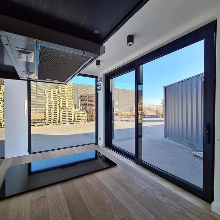 Contenedor de oficina de 20 pies totalmente modificado: lateral abierto con puertas correderas de cristal, aislamiento Dritherm, electricidad empotrada de alta especificación, iluminación LED y preparado para aire acondicionado.